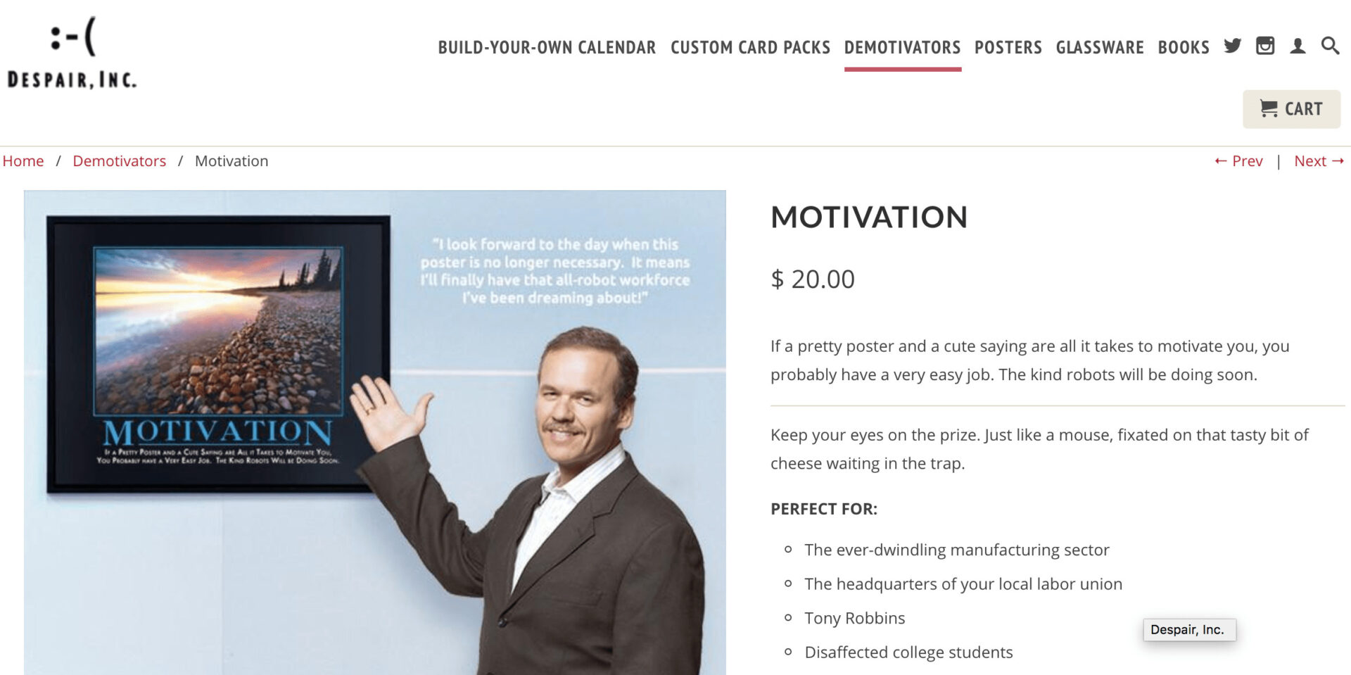 The only posters that have value to me are the cynical “Demotivators” line from Despair Inc, including this gem about the value of motivational posters, that says: