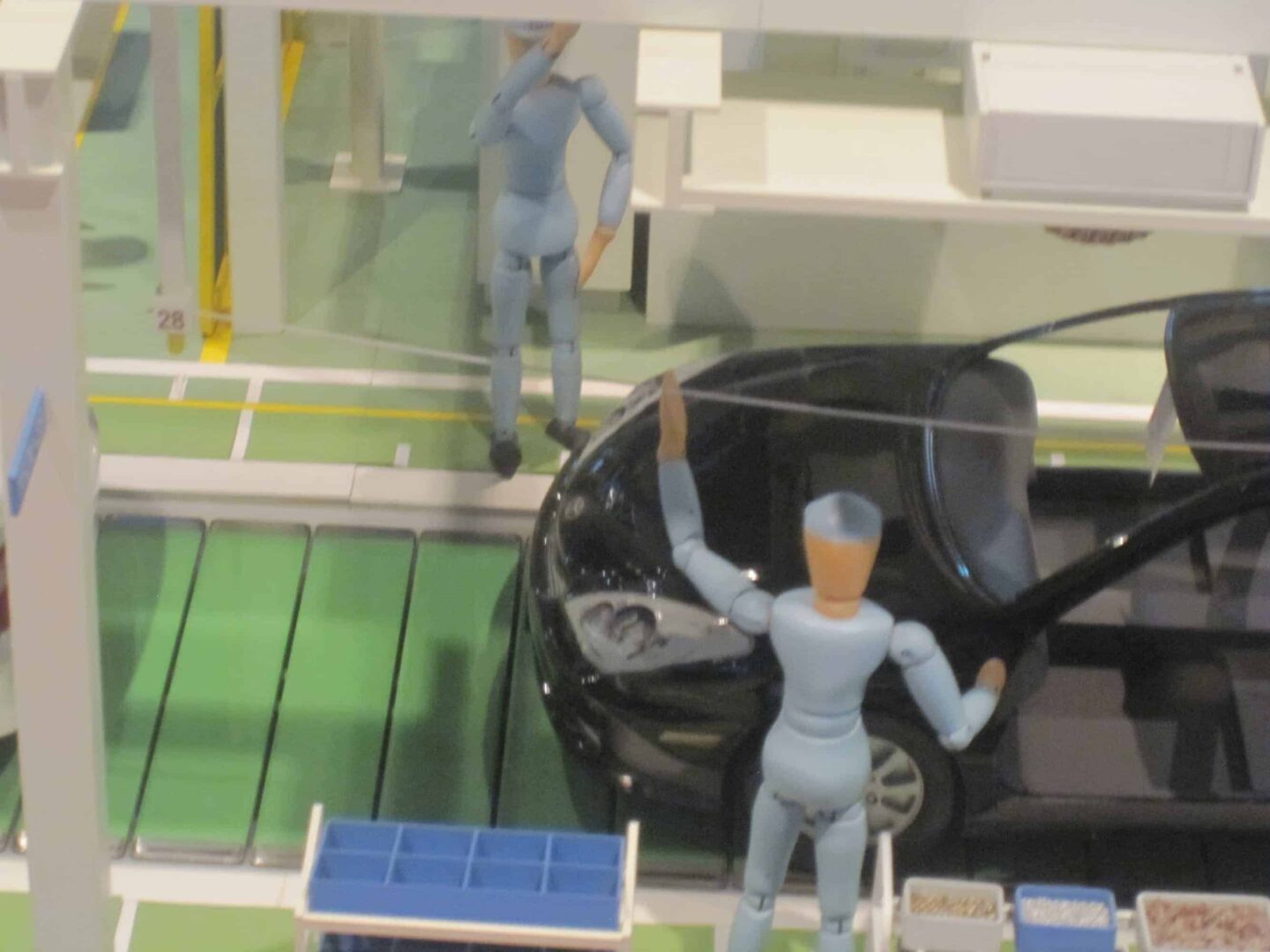 Pictured below is part of an animatronic diorama that's in the Toyota City visitor center. You can see the little figure reaching up to pull an “andon cord” above the line. The andon cord is often described as something that “stops the line” to ensure that defects don't get passed along.