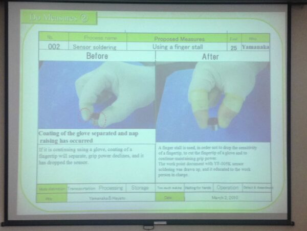 The team went through some pretty rigorous PDCA problem solving. They collected data on the number of drops and the cost. They did Pareto charts about where, in their cell, the drops were occurring and why. They had a lot of discussion within the team about possible countermeasures. They created a “Kaizen newspaper” of 17 possible countermeasures and prioritized their testing and implementation based on a number of factors (using an evaluation matrix).