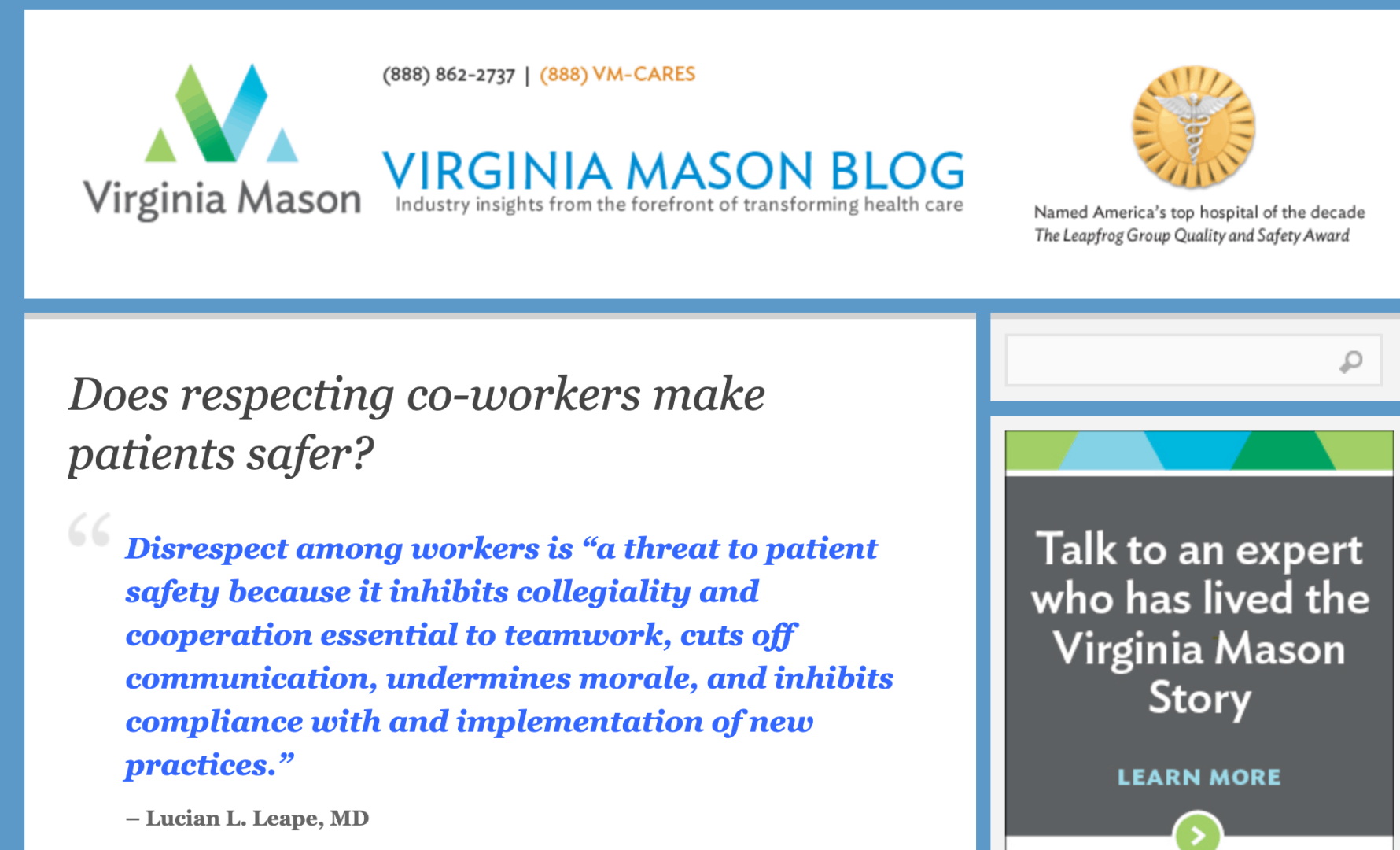 As a leader in adopting and adapting Toyota management methods to healthcare, Virginia Mason understands that “respect for people” is a core part of this philosophy (as I've recently blogged about). Respectful behavior is an active choice we make each and every day. Disrespectful attitudes and behavior can interfere with providing the best patient care.