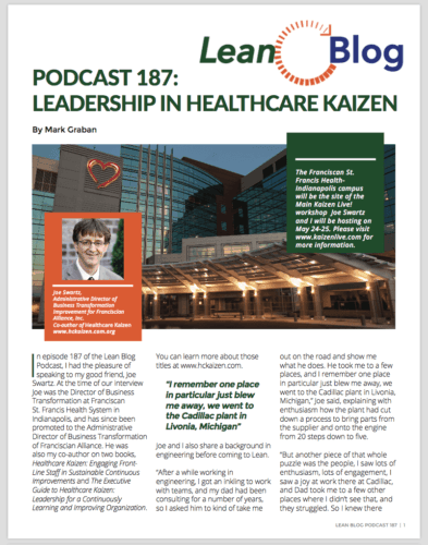 In episode 187 of the Lean Blog Podcast, I had the pleasure of speaking to my good friend, Joe Swartz. Joe is the Administrative Director of Business Transformation at Franciscan St. Francis Health System in Indianapolis, and is my co-author on two books, Healthcare Kaizen: Engaging Front-Line Staff in Sustainable Continuous Improvements and The Executive Guide to Healthcare Kaizen: Leadership for a Continuously Learning and Improving Organization. You can learn more about those titles at www.hckaizen.com.