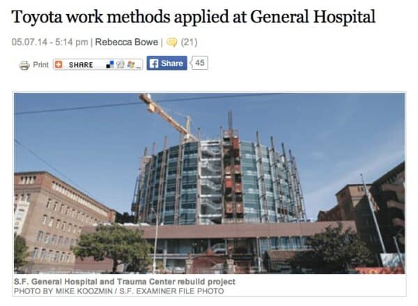 Speaking of California, I recently saw this article about San Francisco General Hospital: “Toyota work methods applied at General Hospital.”
