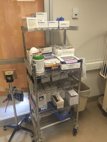 See, I do some real work too. That's a standardized supply cart that's kept in between every two E.D. rooms. Point of use (or pretty close to the point of use).