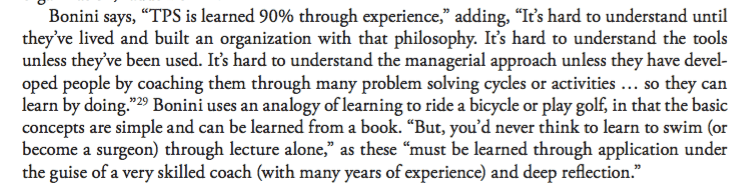 Lean is about “learn by doing” — with a good coach. A book alone won't make someone a Lean thinker until they try… and start practicing (Practicing Lean, eh?). You can now buy “Practicing Lean” through the Amazon Kindle store, by the way.