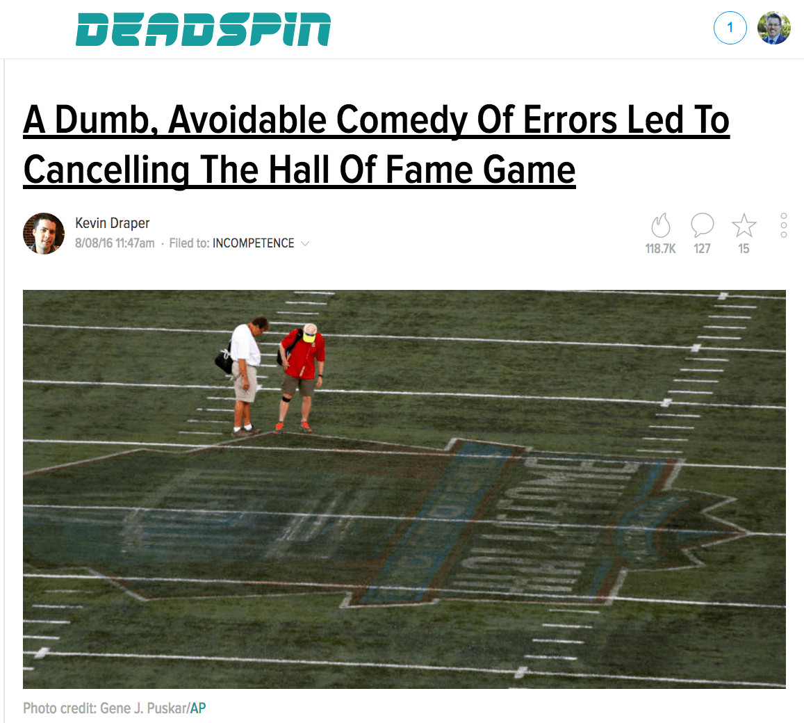 Credit to SB Nation for avoiding blame: “It's not entirely Tim McGraw's fault the NFL cancelled the Hall of Fame game“