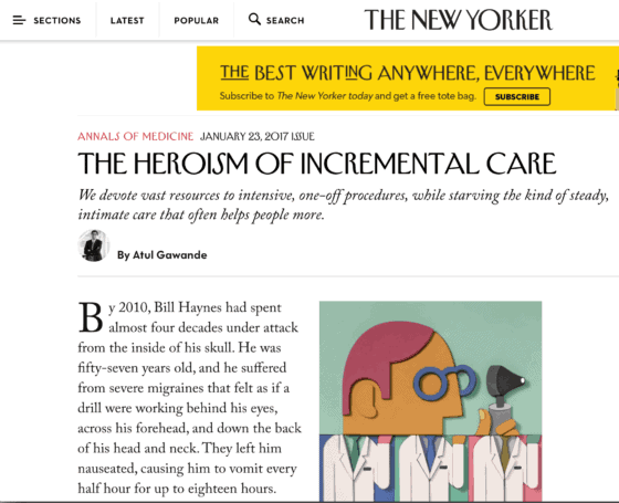 I recently saw Dr. Atul Gawande (see my previous posts about him) on TV, talking about our healthcare system and his most recent article for The New Yorker about “The Heroism of Incremental Care.”