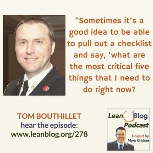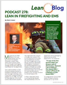 In the Lean community (and in businesses and hospitals, as well), people often talk about “fire fighting” in a colloquial way. Today, my guest for episode #278 of the podcast is an actual professional fire fighter, Tom Bouthillet (@tbouthillet on Twitter). He serves as Fire Captain / Paramedic for the Hilton Head Island Fire Rescue where he is the Cardiac Care Program Manager (STEMI and CARES Site Coordinator).