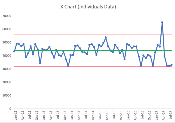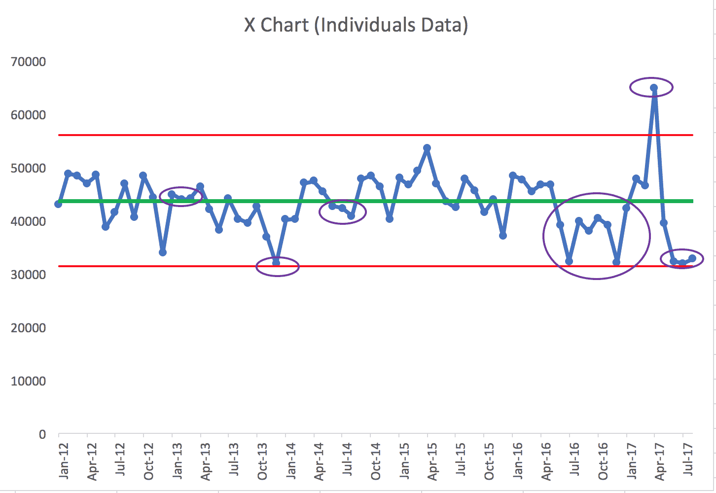 If I create a Process Behavior Chart (using the first 20 data points from January 2012 as the baseline), we see this: