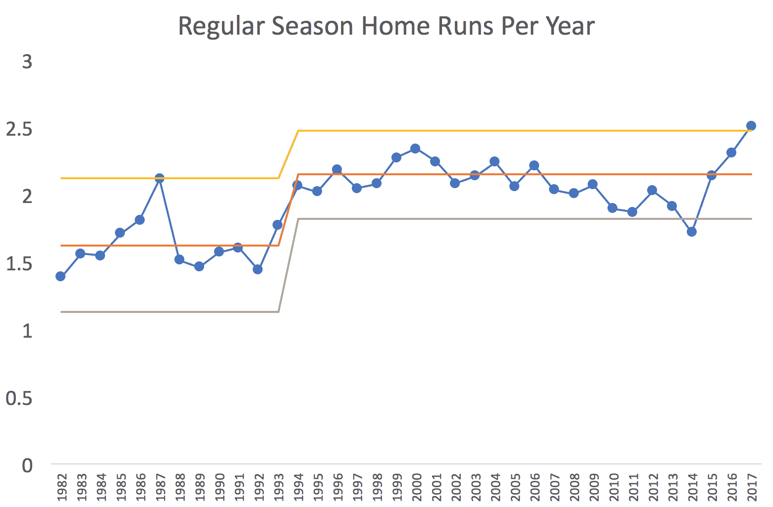 In the PBC methodology, we choose a baseline timeframe. I calculated the average of the first 20 years to be 1.82 home runs per game. For each data point, we calculate the “moving range” (the absolute value of the difference between each year's number) and then the average of those moving ranges, which was 0.75.