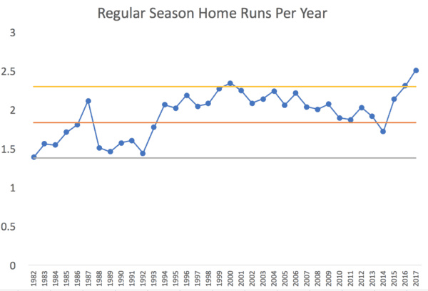 CONCLUSION: This 2017 season with the most home runs ever IS statistically significant. It's a “signal” that the system has changed. It's worth asking “why?” if we so choose.