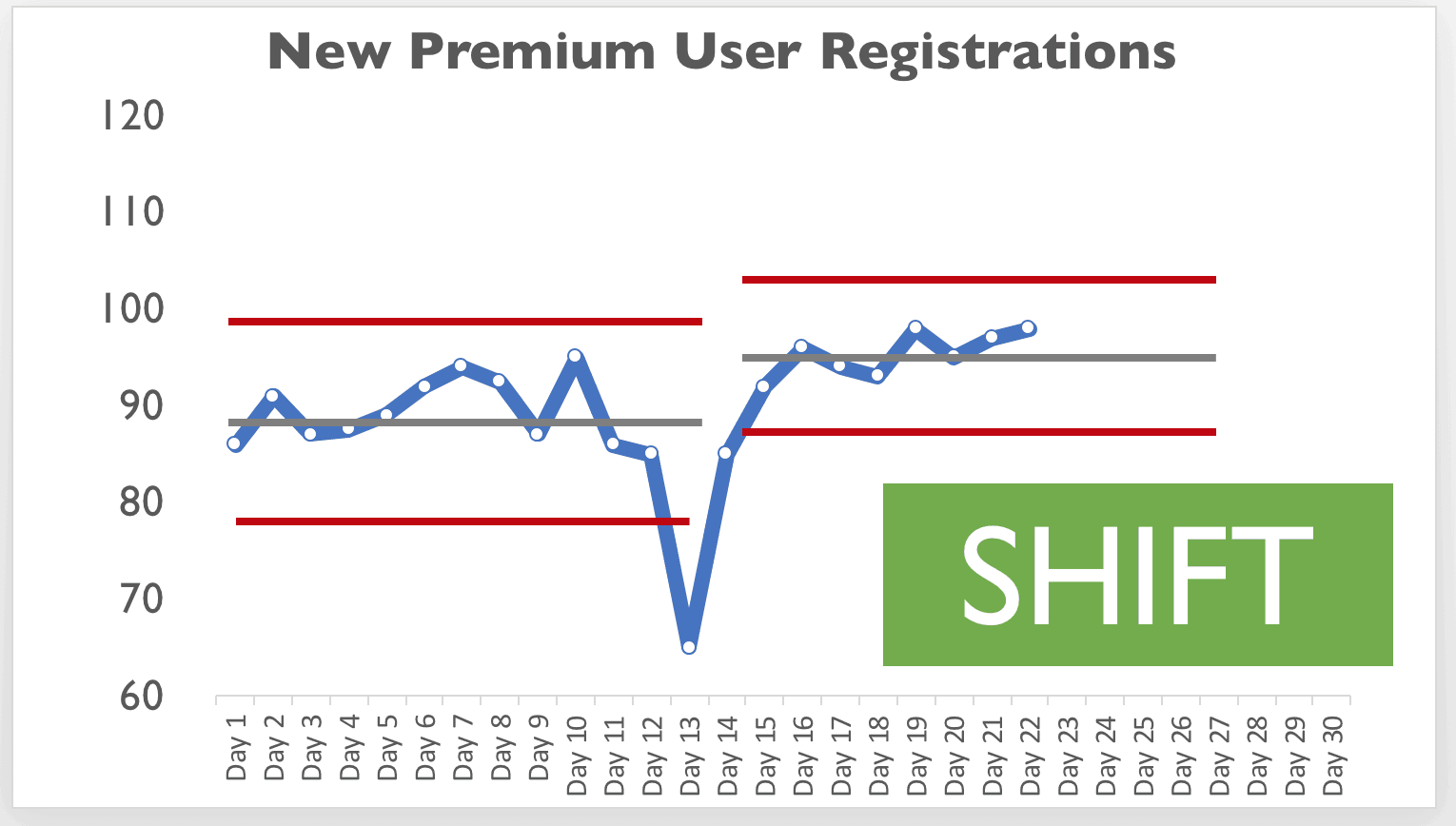 It's worth investigating to make sure we know why performance has improved so that we can lock in that change to the system. We might calculate new limits that help visualize a shift in that performance. We'd say, “Well, now we would predict that our average number of registrations would be more like 95 a day instead of 90 a day.”