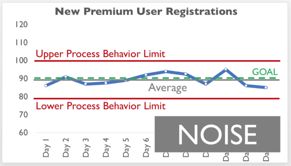 When we move from vanity metrics to what Eric calls 'actionable metrics,' it's really important that we don't turn these into overreaction metrics. Share on XLet me share an example that's very typical of different organizations I've seen. We might have a metric, new premium user registrations. That might be core to our business model. We have a data point of about 86.