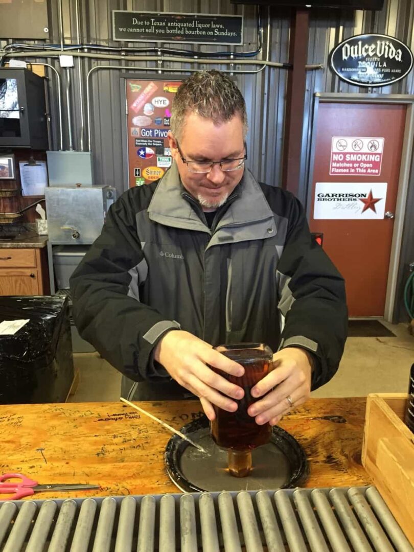 In that post, I shared pictures of me working to dip bottles of bourbon into a sealing wax. I was wearing a winter coat because it was February in Texas and there was a bit of snow and ice that week.