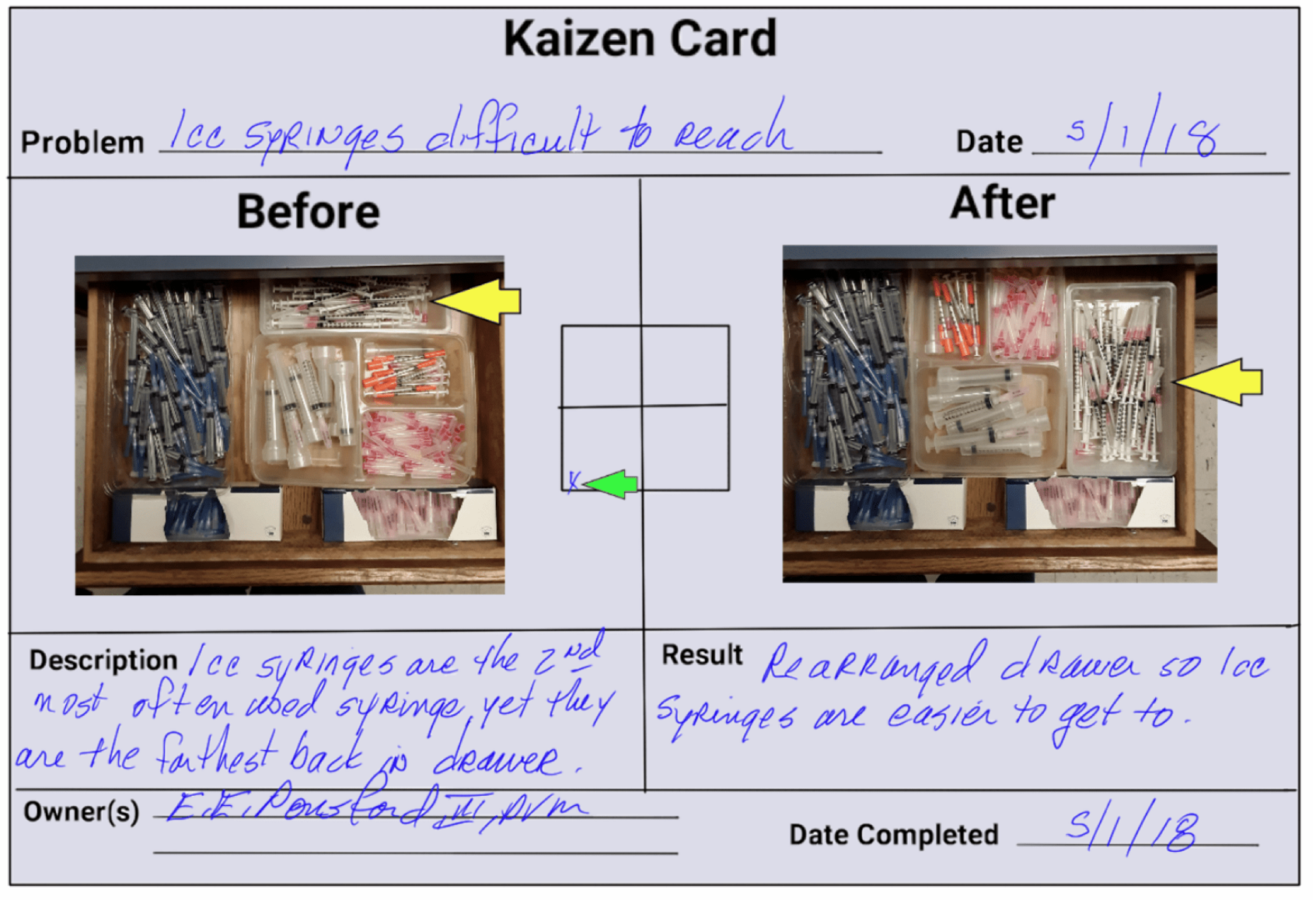 One example of an improvement that Chip implemented was as simple as making syringes easier to find in a drawer, as documented here: