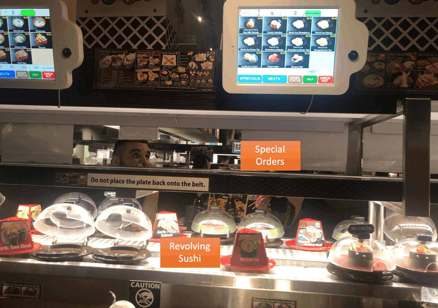 There's the revolving sushi — you're free to grab anything there that you like. But up above is a linear conveyor belt that sends special orders from the kitchen to you without revolving, as I've annotated below: