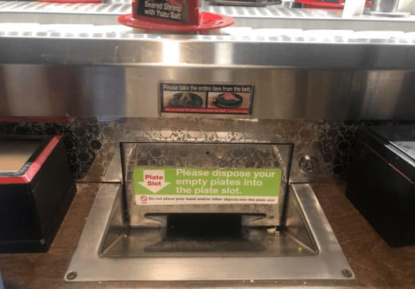 Otherwise, the billing is pretty automatic. The special orders are tied to your station and the tablet. Also, when you are done eating anything you took off the conveyor, you put the plate in this special chute: