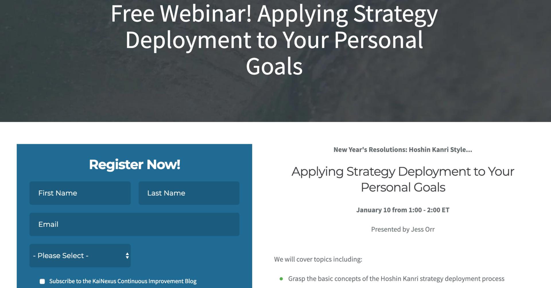 Mark: I'm sure it will be and would encourage people listening to go and register for the webinar. You can do so at www.kainexus.com/webinars. Jess is going to be presenting about New Year's resolutions Hoshin Kanri style, applying strategy deployment to your personal goals.