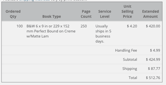 Printing and shipping a batch of 100 books would cost $5.12 per book.