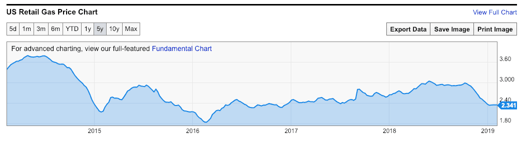 According to YCharts.com, the five-year trend for unleaded gas prices looks like the chart below (and diesel fuel prices seem to correlate pretty well).
