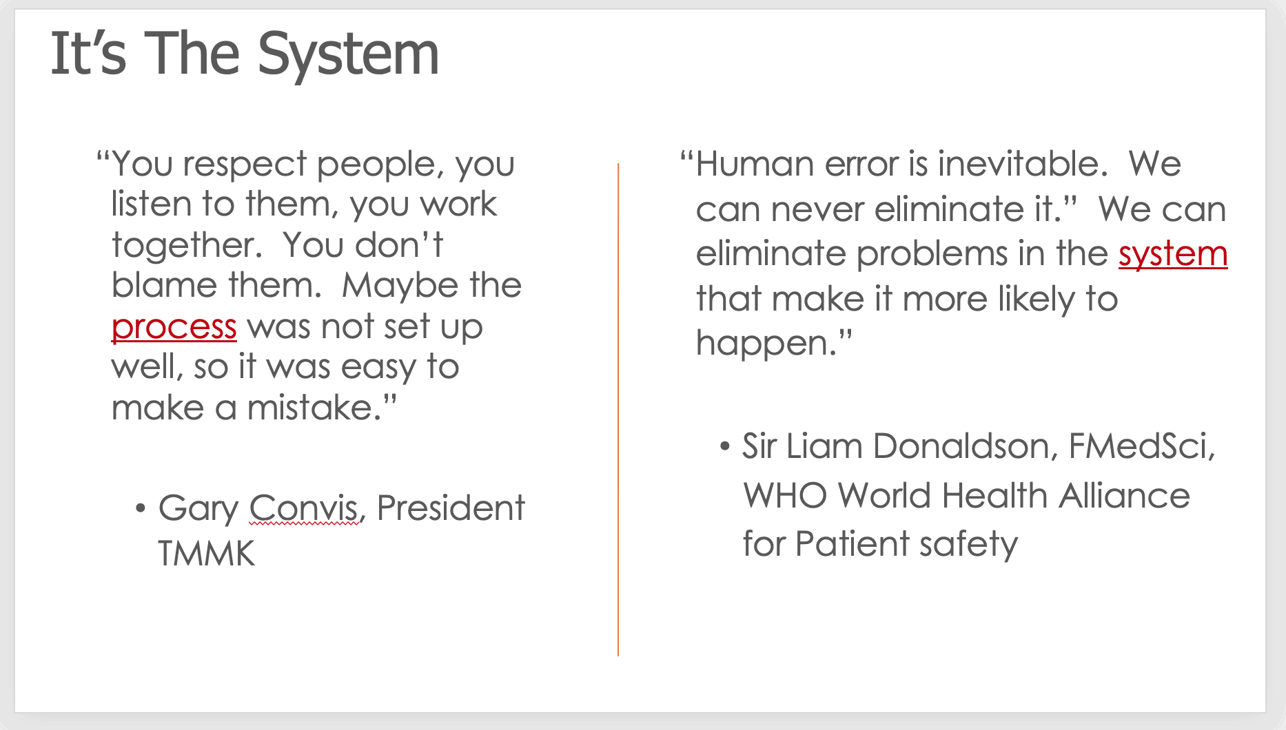 We all make mistakes. Human error is going to occur… so instead of throwing up our hands and saying, “What can we do?” we need to have systems in place that either prevent errors… or we mitigate the errors so they don't turn into harm.