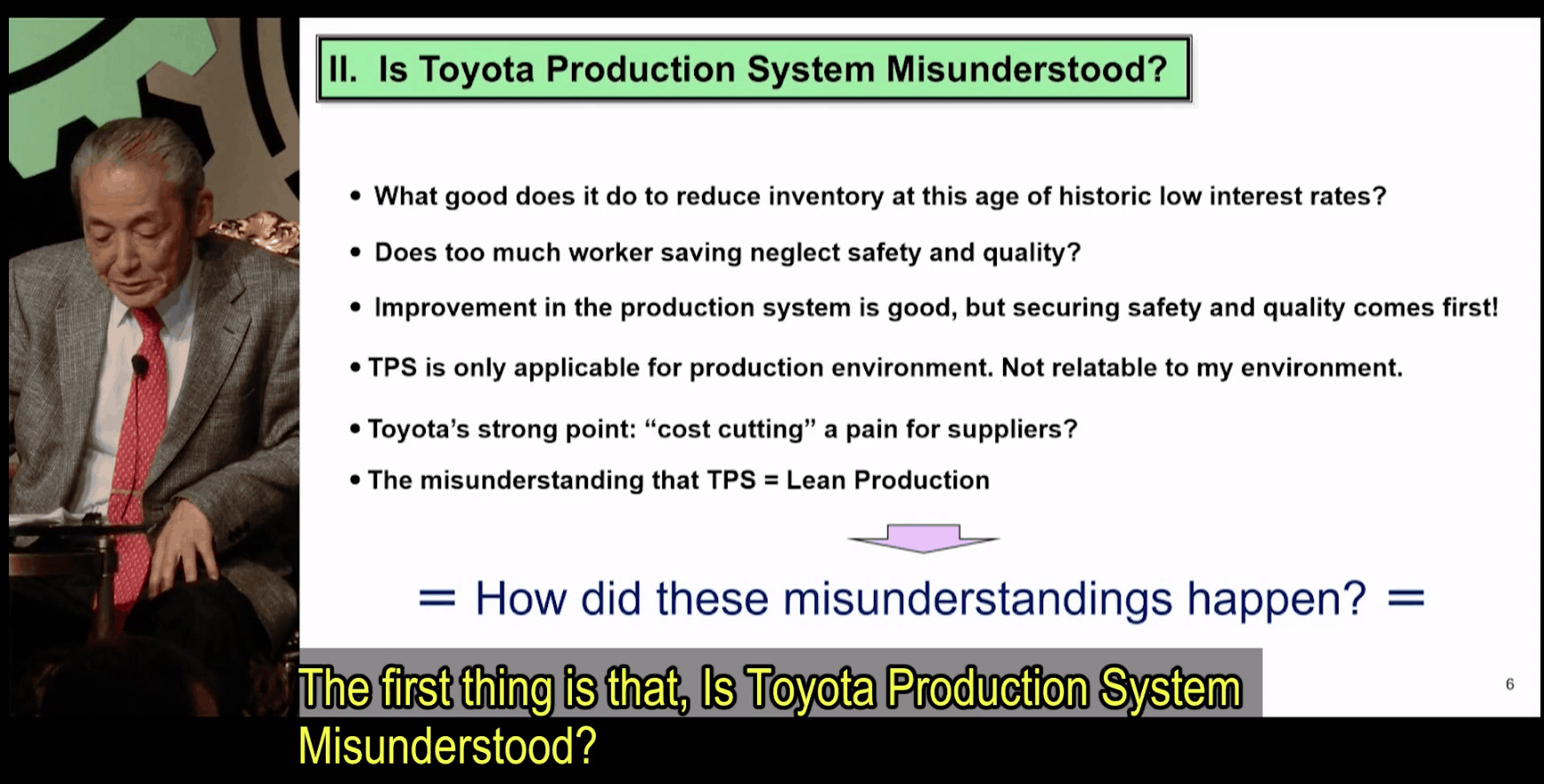 Bob – Mr. Hayashi didn’t elaborate (and I wish he would have), but the subtitle says, “The misunderstanding that TPS is an improvement method born in a production plant.”