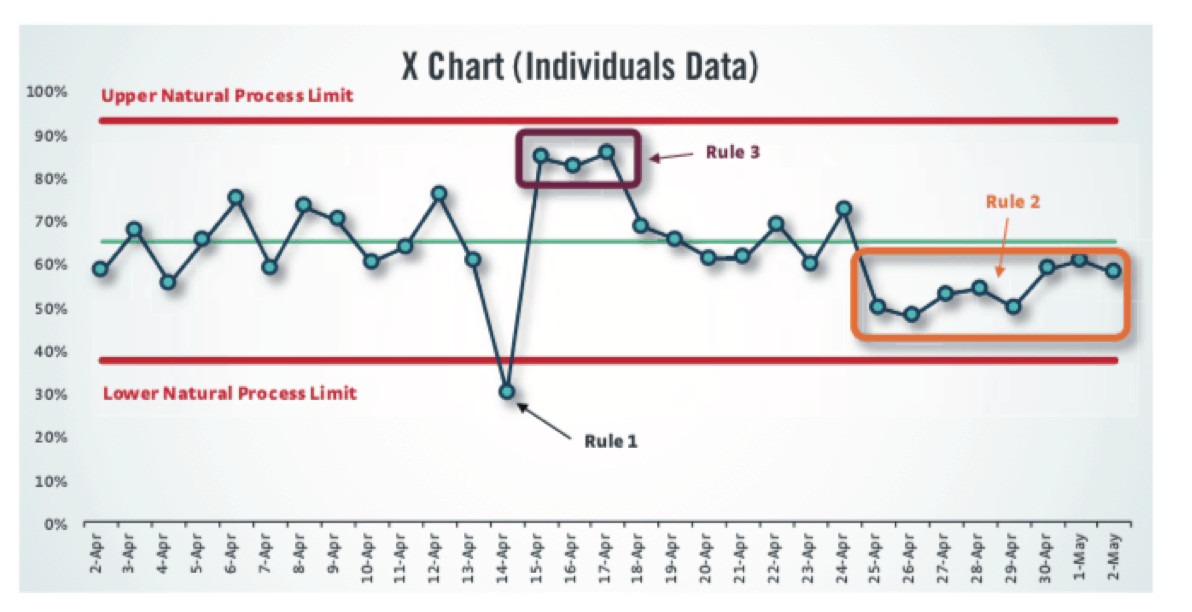 Mark: When we make a Process Behavior Chart, there's three rules that help us find a signal that, again, that says something has really significantly changed in our business.