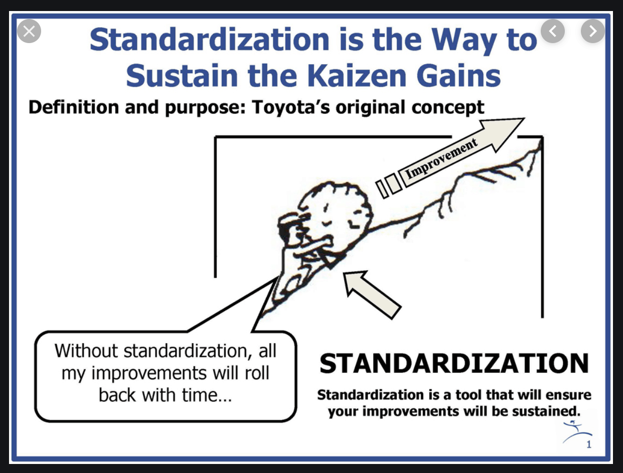 We can't have that (and LEI and Toyota wouldn't want injuries), so people started illustrating standardized work as a “wedge” that locks in improvements. Sometimes, the wedge is labeled as something like “Lean Management System” (it's a versatile illustration, apparently).