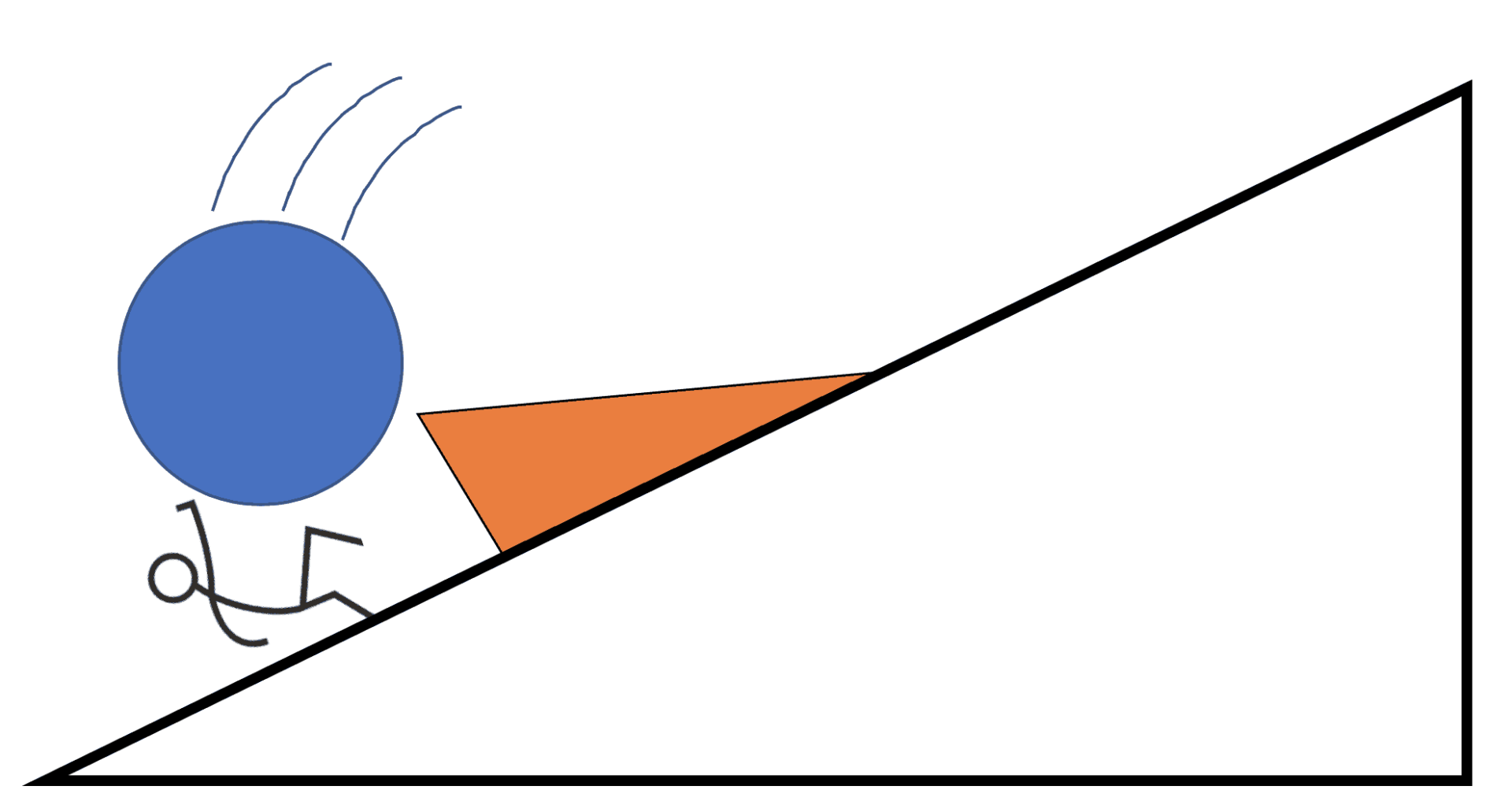 I don't understand the physics of that one at all. Is that wedge really wedged into the ramp or the mountain that the boulder is sitting on? That stick figure looks a bit concerned, perhaps. Maybe he has a hammer to really pound in that wedge.