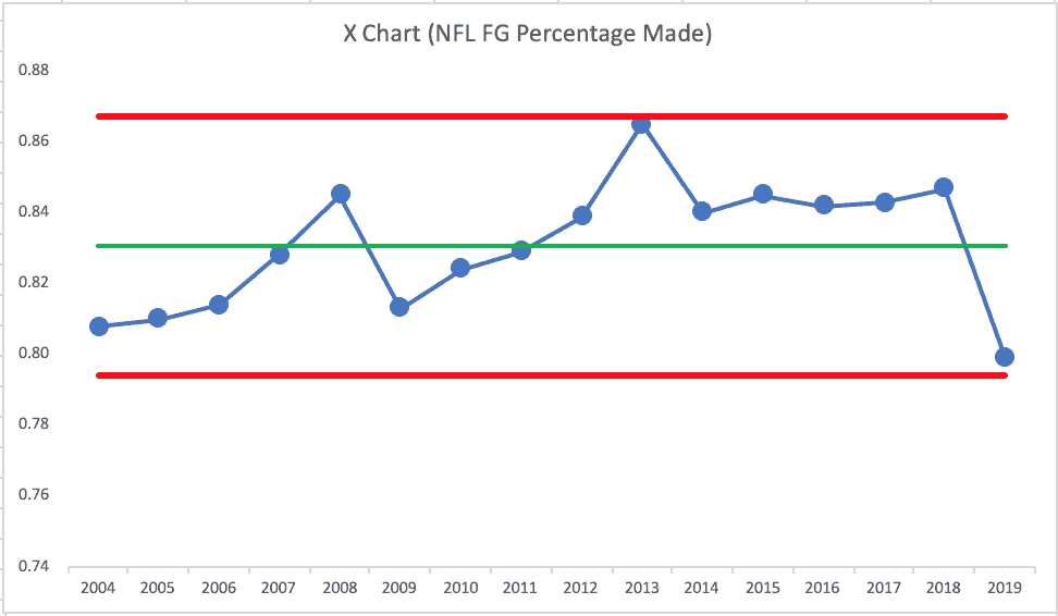 From this longer-term view, I'd probably recalculate a new average and new limits starting in 2006 when we have the first of a long run of above-average data points. Why did field goal accuracy improve in 2004 or 2006?