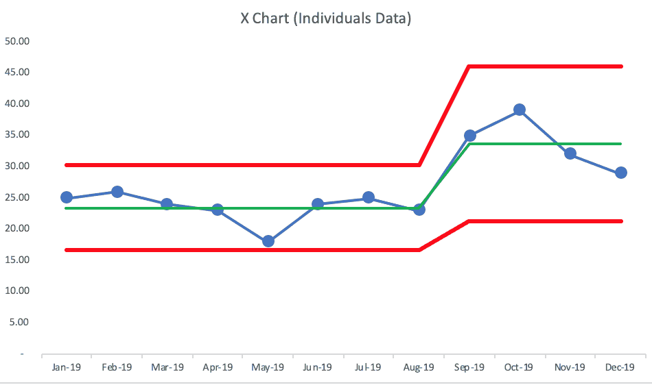 We see clear signals that show us the system changed during the year. The first eight data points are below the average. Then, it appears the system changed in September, as we now see that October's data point is above the calculated upper limit — more evidence of a signal… showing us the system has changed in a meaningful way. The data is NOT randomly fluctuating around a single average over this timeframe.