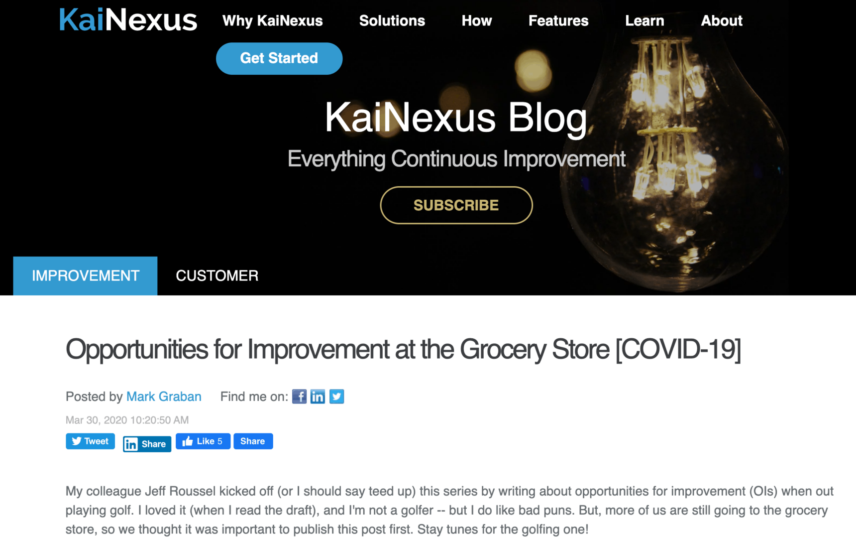 I wrote a blog post for KaiNexus that's the first in a series that we're going to run about “Opportunities for Improvement” in everyday situations like golfing, walking for exercise, getting take-out food… or my post about going to the grocery store and what we (and the stores) are doing better (or could do better). We could also call these small “Kaizen” improvements.