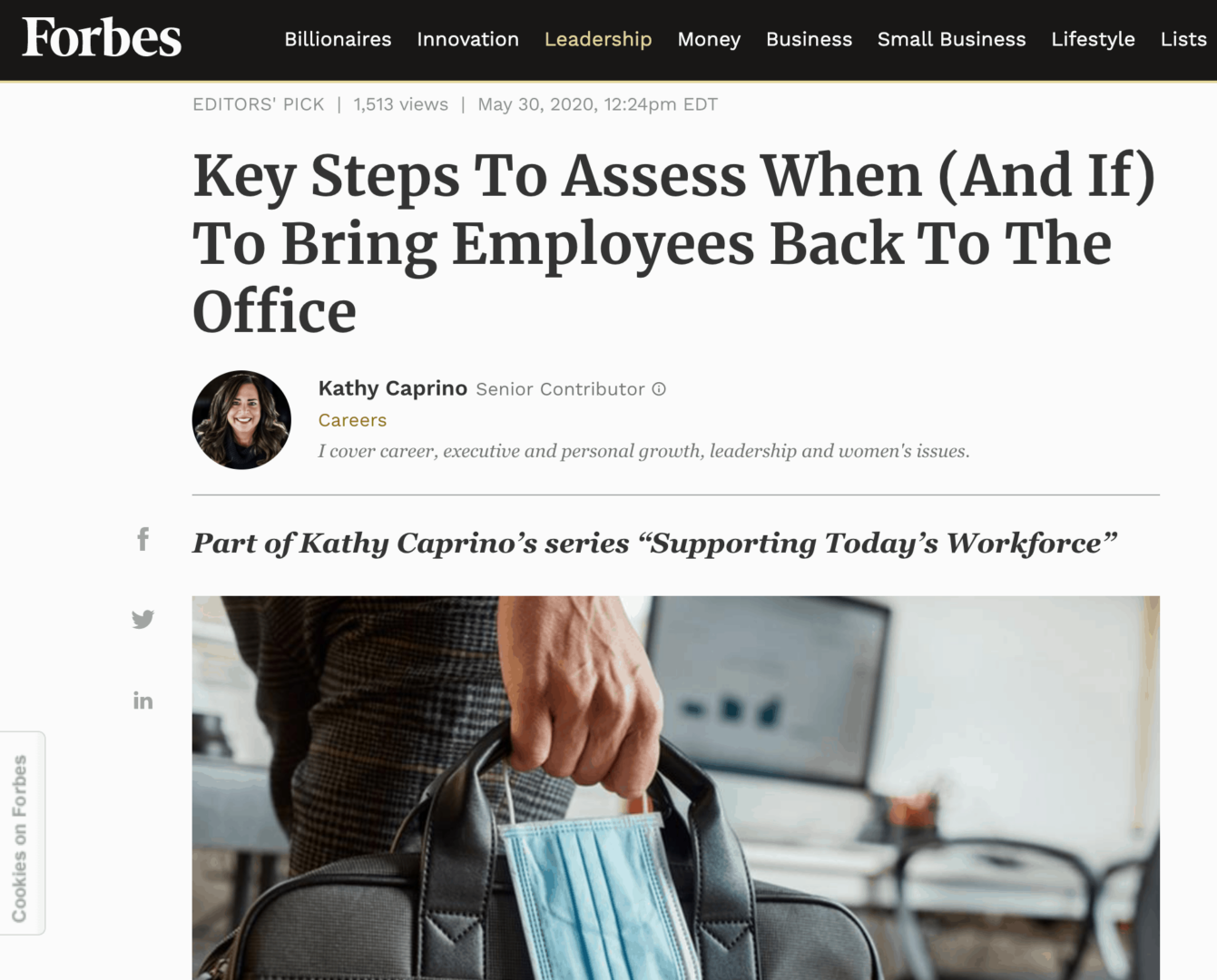 I was asked by a writer for Forbes.com to share some thoughts on re-opening workplaces safely (or as safely as reasonably possible).