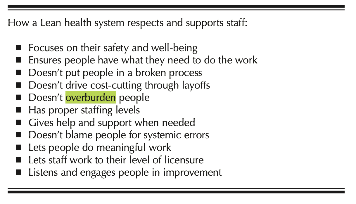 Again, overburden is BAD. Dealing with the unprecedented workloads in a Covid era is a huge challenge, but a truly Lean hospital would have enough employees (and enough equipment and enough medication) to meet patient needs without overburdening people.