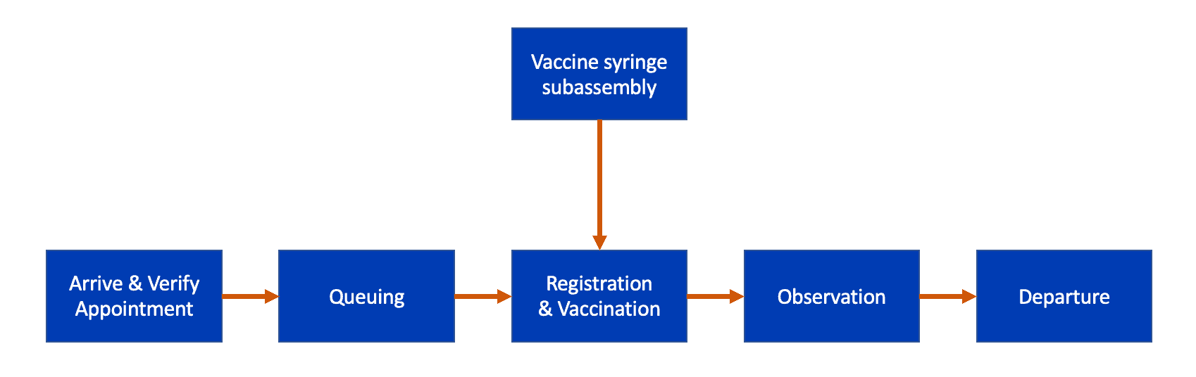 My next blog post will be about the benefits of “drawing vaccines in a specialized subassembly area” rather than drawing up the vaccines at each table. When we combine the patient flow with the syringe flow, we might see a schematic like this: