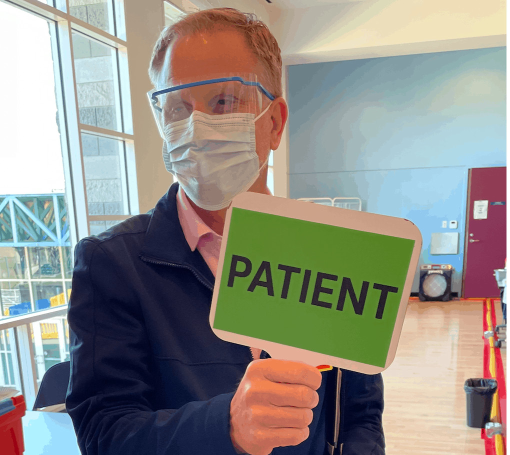 At RIMAC, at the front of the queue closest to the vaccination room, they had four dots on the floor that were staging patients who were ready to be sent next to a vaccination table. There were volunteers tasked with look for signals given by tables when they were ready for the next patient. The photo here shows Brian Hand holding one of those paddles.