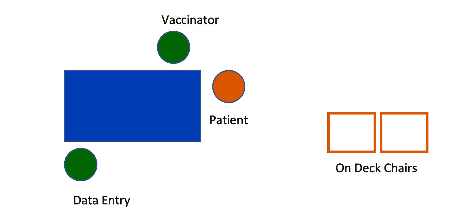 I saw many instances where the patient arrived at the on-deck chair just as the previous patient was leaving the vaccination table (where the cycle times were only 60 seconds, by the way). “No, you don't have to sit there, come on over.” They could vaccinate up to 60 patients per hour with this workflow (but accounting for variation and other issues, they might not hit that ideal rate).