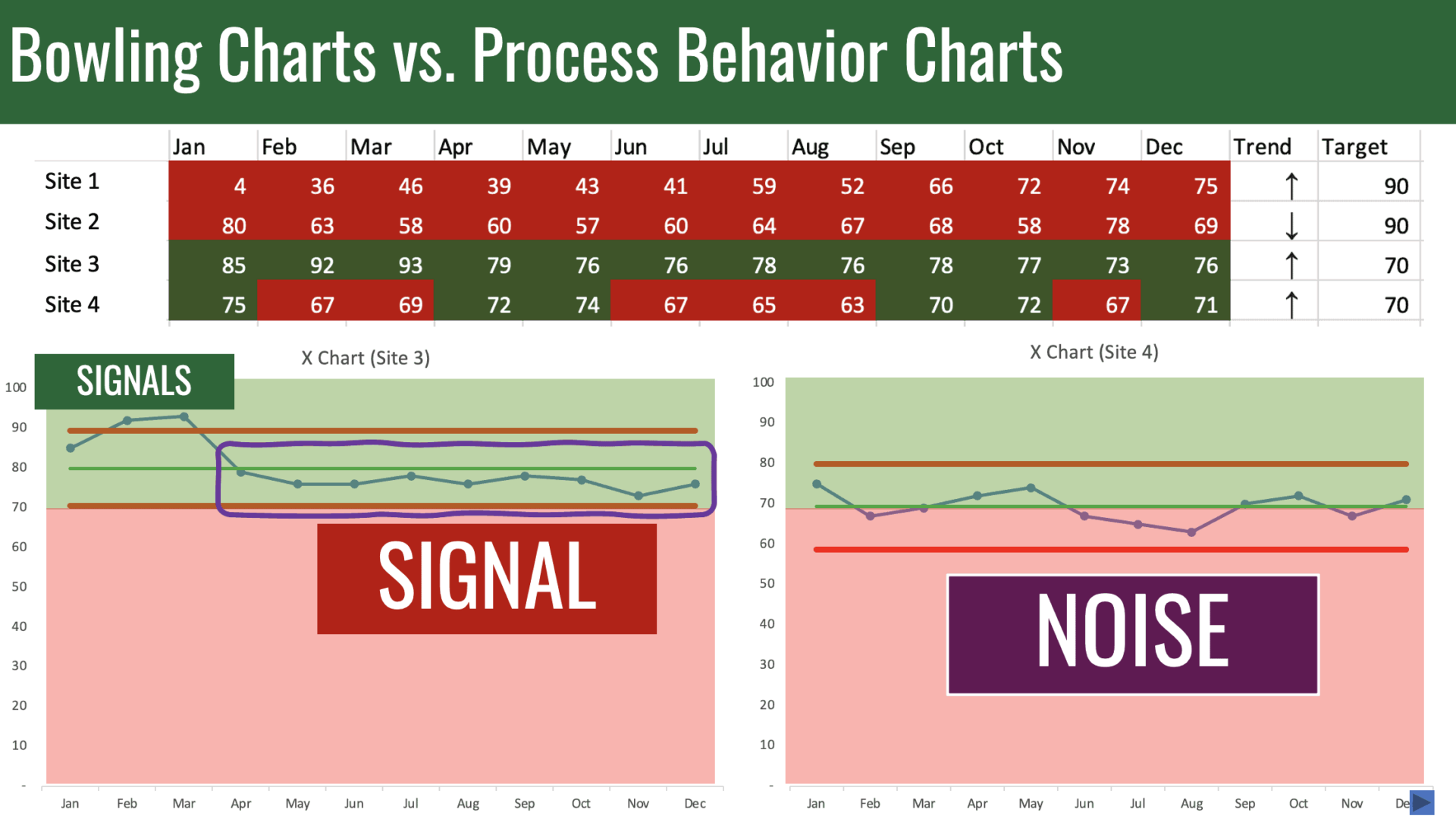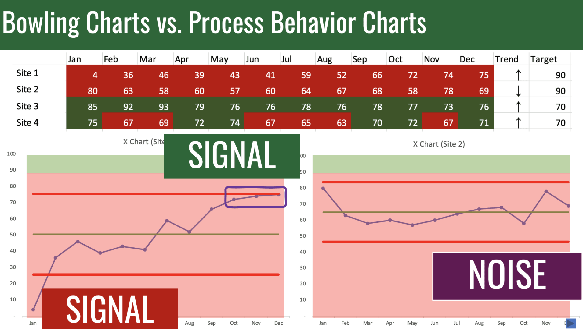 With site one, we have a signal in the positive direction. These three data points. There was a signal at the beginning of the year. Site one shows significant evidence of improvement. We may want to reward that effort or understand why that was. Site two, we see nothing but noise. It's fluctuating around an average.