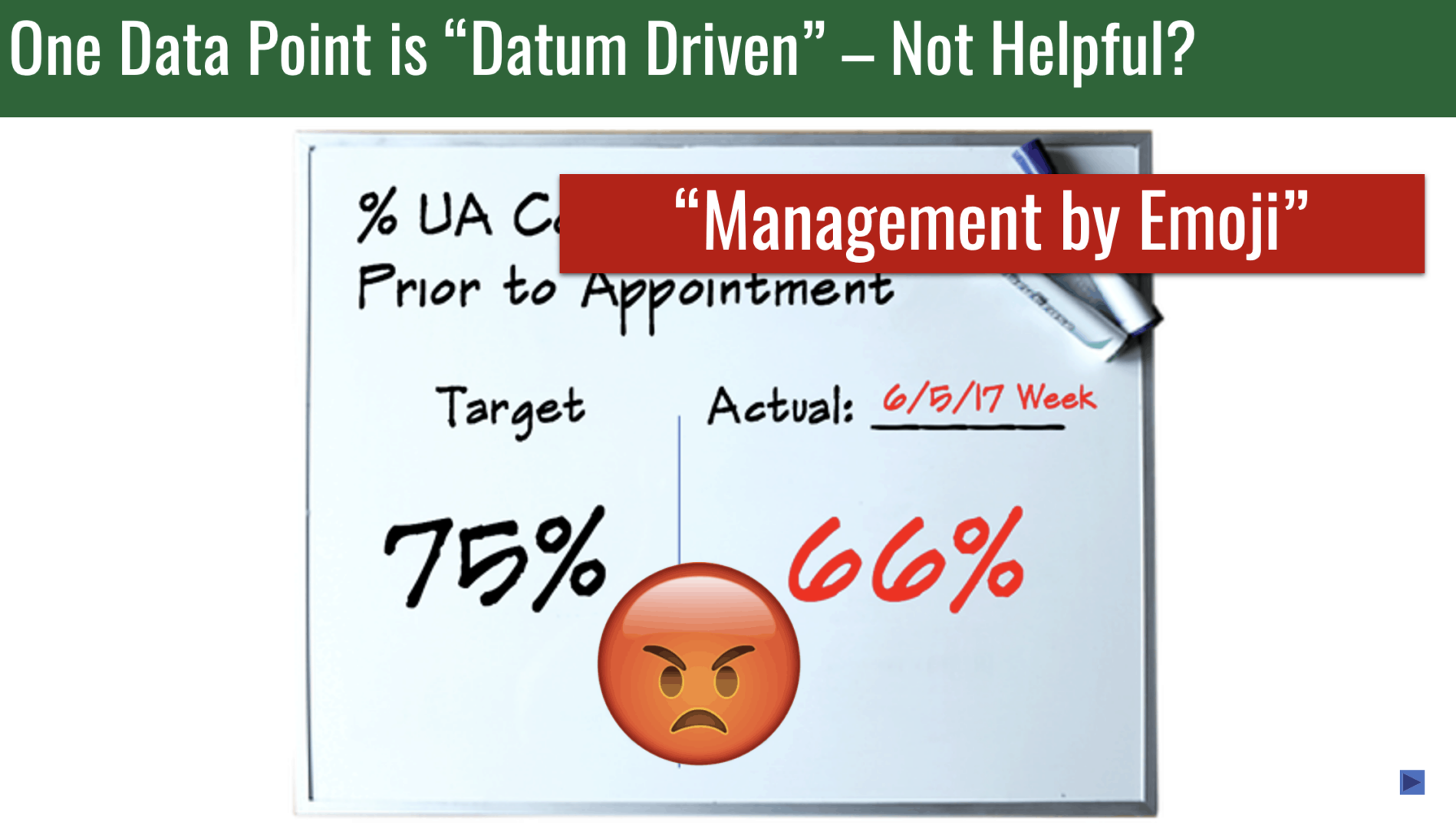 We don't try to improve by reacting to this last data point. We need to step back, maybe do any three, and ask, “What can we do to boost overall performance of this metric?”
