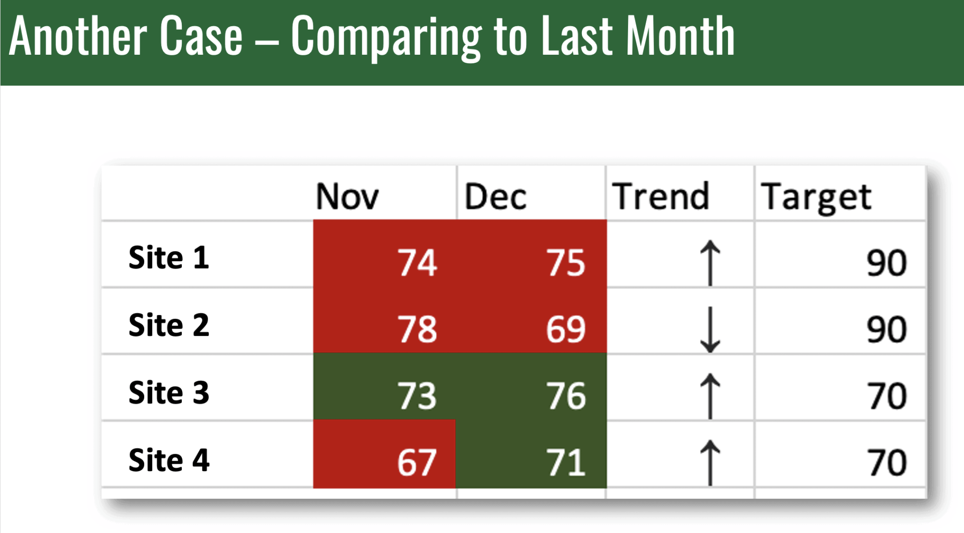 We have color coding. We've got some red. We've got some green. There is sometimes a “trend signified.” This up arrow or down arrow is not a statistically meaningful trend. It is a simplistic comparison of December for site one is higher than November. Do we really need an arrow to point that out?