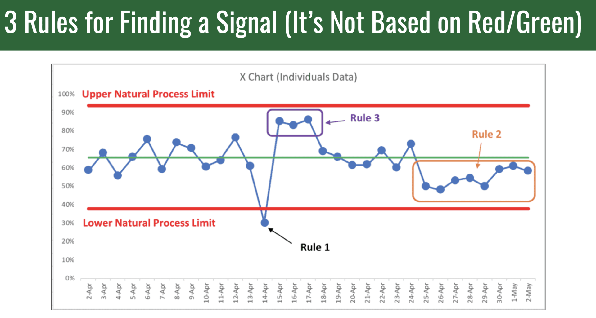 We have three rules for finding signals. One is any data point outside of the lower and upper limit that are calculated from the baseline timeframe. This data point is extremely unlikely to be randomly occurring. The signal tells us, “Ah, something has changed,” either as a result of something we did or something that just occurred. Either way, that's the time to go looking for a root cause.