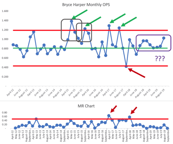 In the 2019 “bust” season, Harper's OPS was actually at or above his career average each and every month. But, fans (and the media) had been accustomed to his previous “outlier” months (data points above the upper limit).