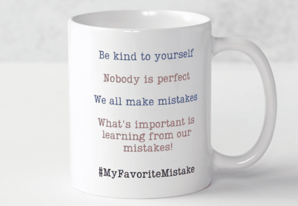 As I often do, I hear the kind coaching voice of Karyn Ross, who lives rent-free in my head (in a good way). I will have a sip of tea and read the mantras / reminders on my #MyFavoriteMistake mug, as shown in the second photo with the post.
