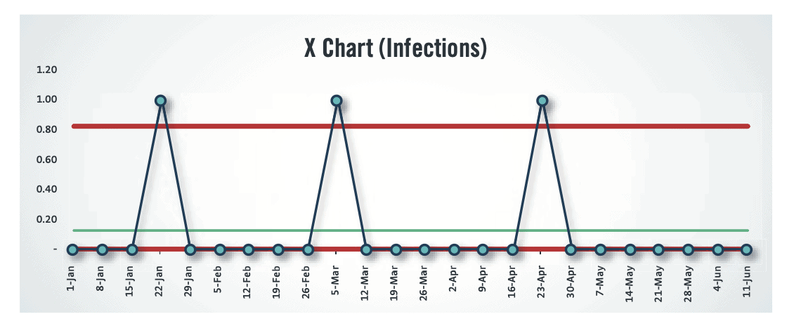 In the X Chart, below, since the average number of infections per week is just 0.13 and the Upper Limit is calculated to be 0.86, any week with one infection appears to be a signal. We could, in this case, investigate each infection's root cause.”