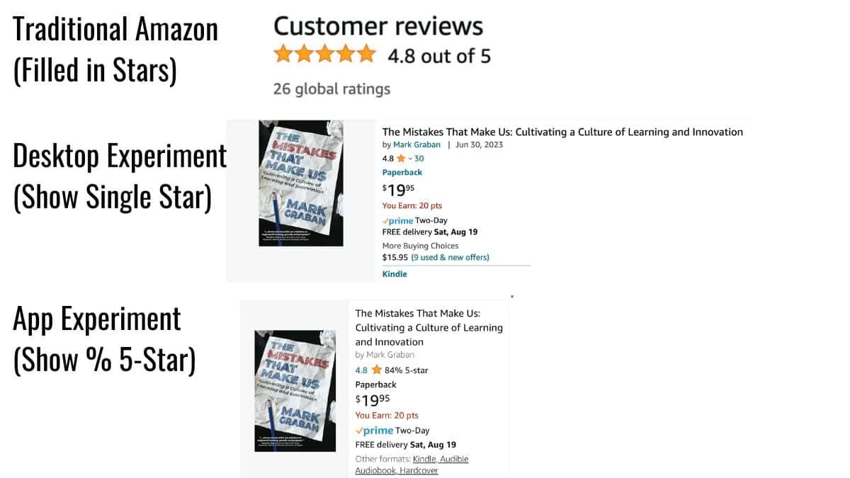 It's interesting to see Amazon experiment with different ways of summarizing and visualizing reviews, average ratings, and the distribution of the ratings — including those for my latest book, The Mistakes That Make Us: Cultivating a Culture of Learning and Innovation.