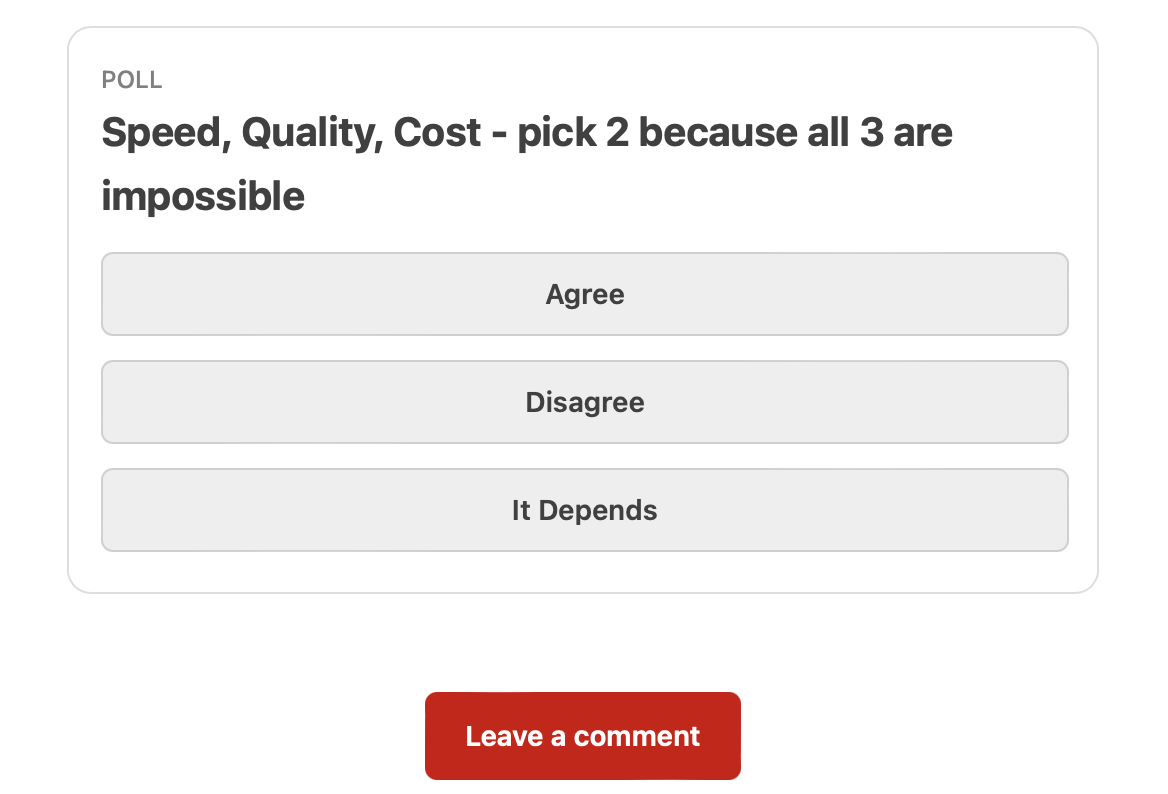 Many of the articles involve hypotheses about tradeoffs, reigniting discussions on common tropes such as the Iron Triangle of Speed, Quality, and Cost (Good, Fast, Cheap – pick two). What is your experience?