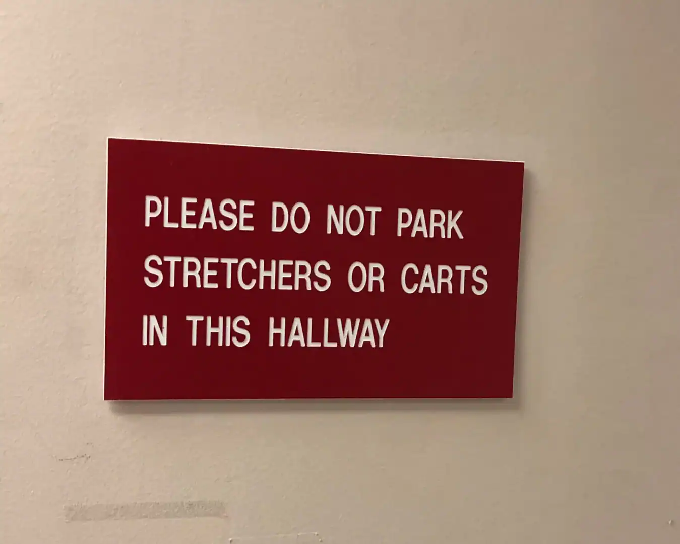 And to be clear, I'm not blaming the employees who placed the stretcher and carts there. They might not have enough “real” storage space or that space might not be the least bit convenient. The sign doesn't instruct anyone where TO park them.