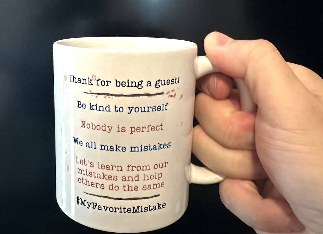 Karyn inspired me to create a coffee mug with four short mantras. I often drink coffee, especially when recording My Favorite Mistake episodes. The podcast logo faces the camera and my guest, but I see the side that reads:
