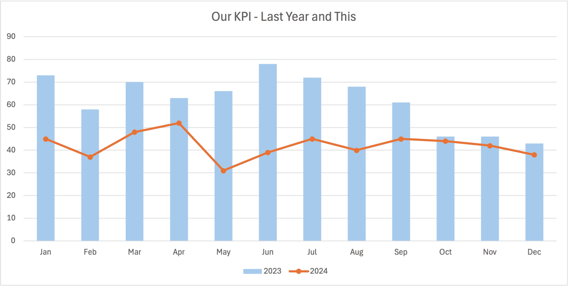 Here's an example of the type of chart I've seen a lot — with last year's data in columns and this year's data as a line:
