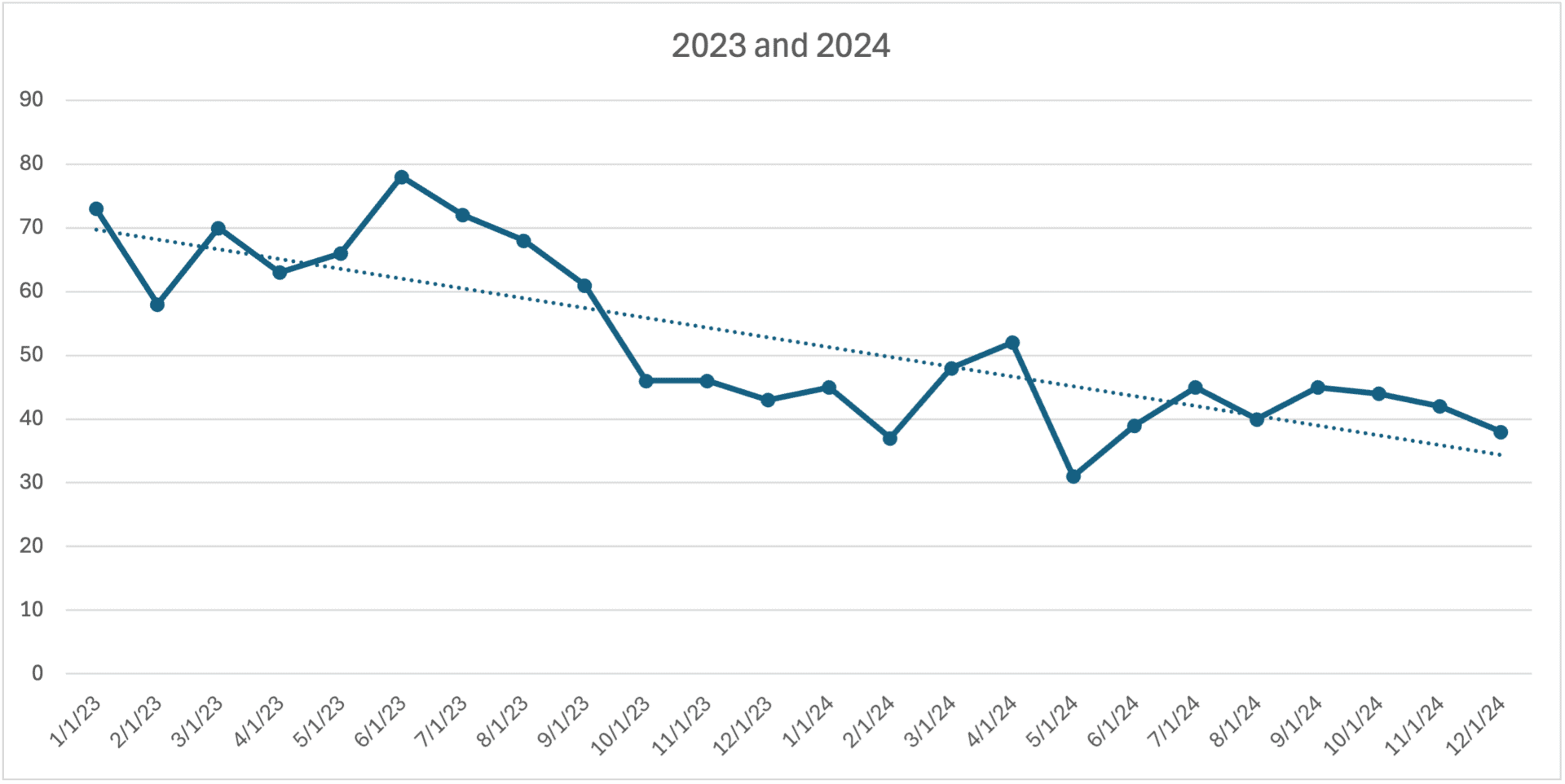 We might be happy that this number has shifted down from an average of 68.5 to a new average of 42.7. But there's no evidence of continued decline. A linear trend line would be mathematically correct but practically misleading: