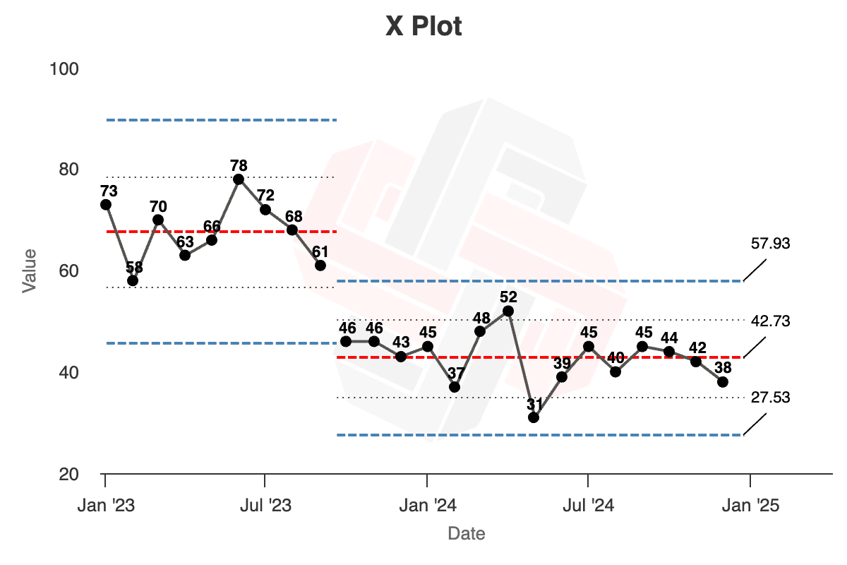 The run chart makes it much clearer that something happened in October 2023 that caused performance to shift downward. It looks like a one-time event, where the metric had been fluctuating around an average of about 65. And now it's been fluctuating around an average of about 43.